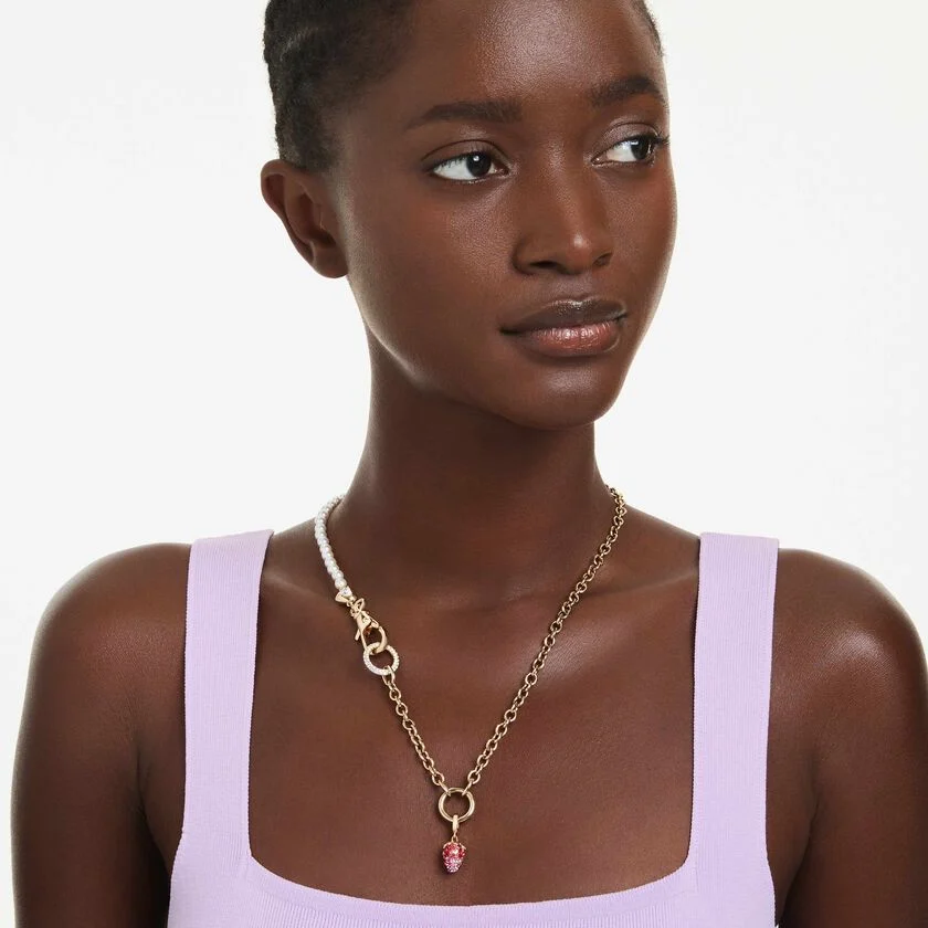 Додавајќи личен печат на вашиот секојдневен стил со овој пресладок привезок во форма на јагода е идеален избор за оние кои сакаат слатка инфузија од природата. Украсена со pavé кристали во четири нијанси на розова и црвена боја, заедно со реалистични семки со златна позлата и кристали, оваа креација има специјално дизајнирана закопчалка која ви овозможува да го носите привезокот на различни ѓердани и нараквици.