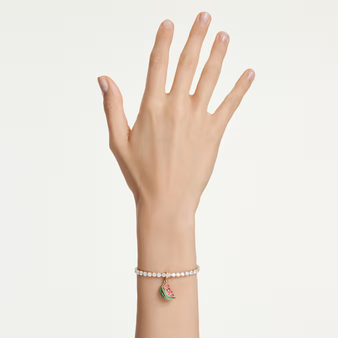 Додадете личен печат на вашиот секојдневен стил со овој приврзок во форма на парче лубеница — идеален избор за оние кои го сакаат летото. Украсен со розов и зелен pavé кристал, заедно со реални семки направени од црни Swarovski ReCreated™ кристали, овој модел со златна завршница има специјално дизајниран механизам за закопчување што овозможува да го носите на различни ланчиња и нараквици. .Инспиративен подарок за оние што ги сакате.